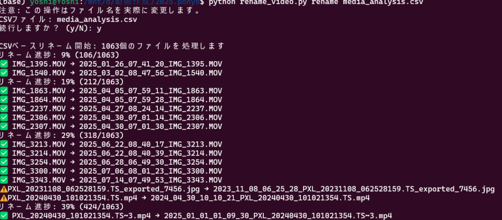 生成された media_analysis_*.csv ファイルを開いて内容を確認してください。❌マークのファイルは正確な撮影日が分かる場合、ファイル名を手動で修正するか、不要なファイルはCSVから該当行を削除してください。