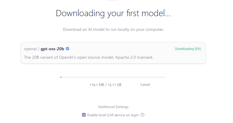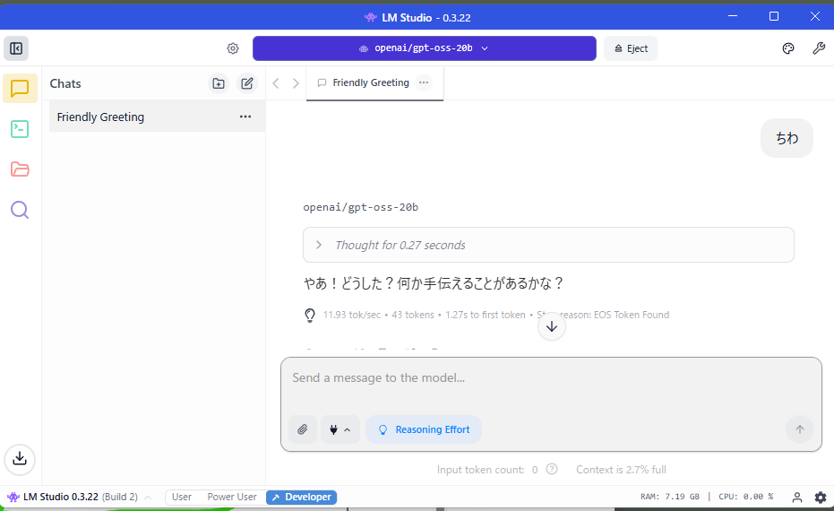 完了したら、画面上部にgpt-oss-20bが表示されていることを確認します。