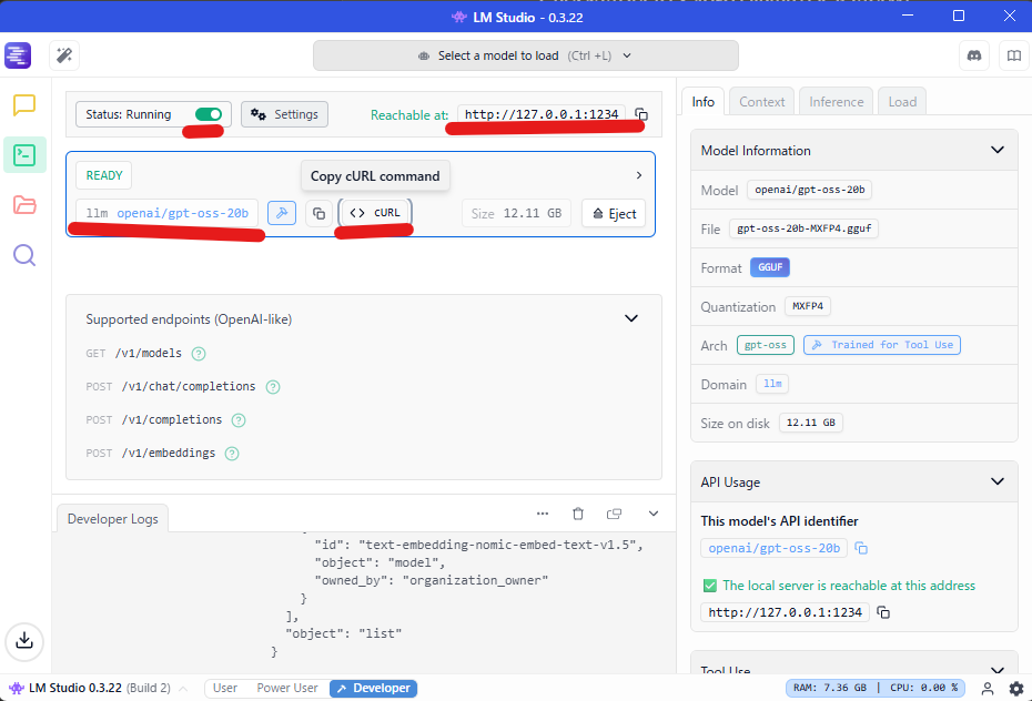 Status RunningというチェックボックスをONにします。モデルは先ほどすでにgpt-oss-20bがセットされてると思いますので、これだけで準備完了です。