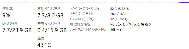 結果、平均で 8.4 tokens/s となりました。チャットでの利用には少し待たされる感じはありますが、VRAM 8GBのGPUでこれだけの規模のモデルがローカルで動くというのは驚きです。