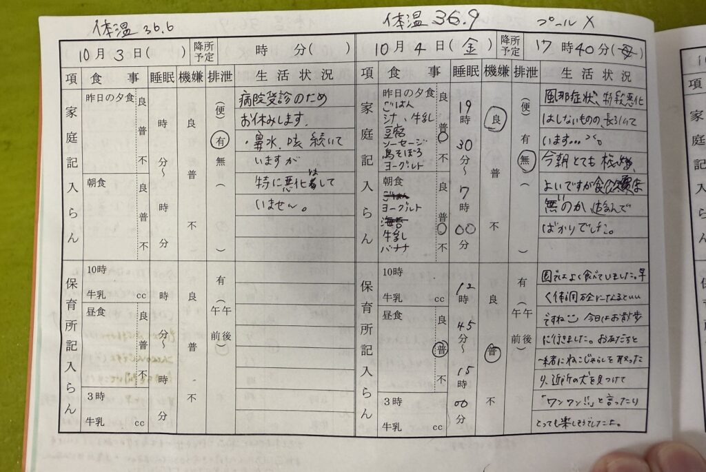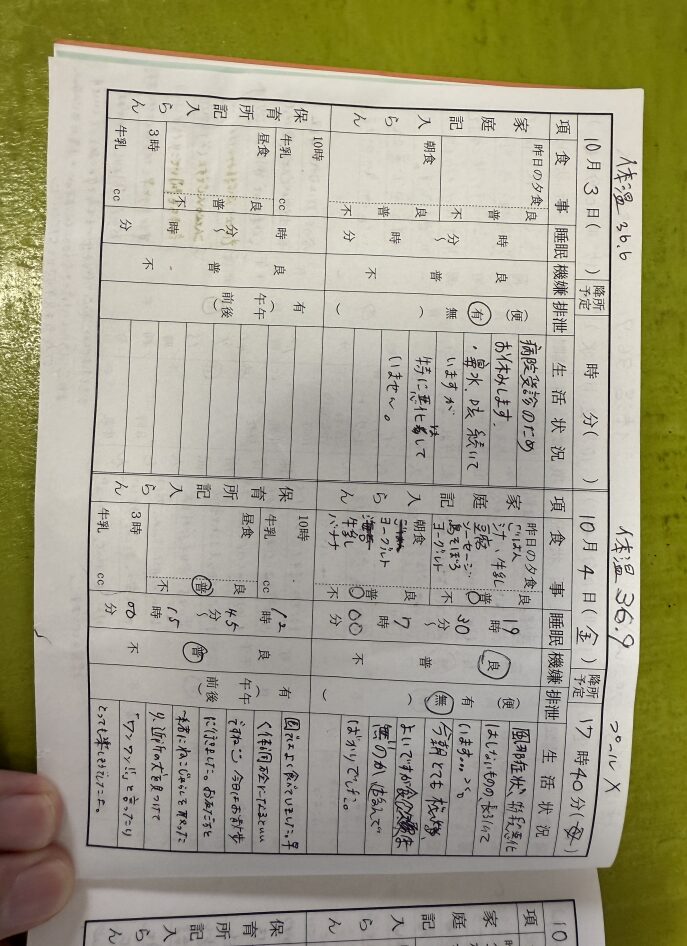 “これは保育園の手帳の画像です。左右でそれぞれの日のデータがあります。”